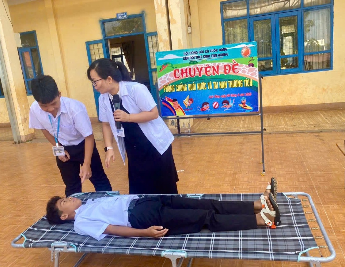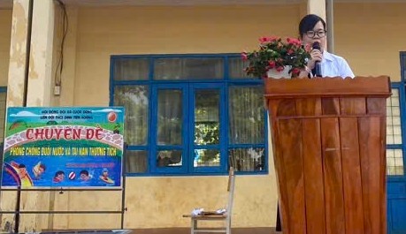 “Loa loa loa! Các bạn học sinh trường THCS Đinh Tiên Hoàng ơi! Mùa hè đang đến gần, những chuyến dã ngoại, những buổi đi bơi đang chờ đón chúng ta. Thế nhưng, các em có biết mỗi năm có hàng nghìn tai nạn thương tích và đuối nước xảy ra với lứa tuổi học đường không?